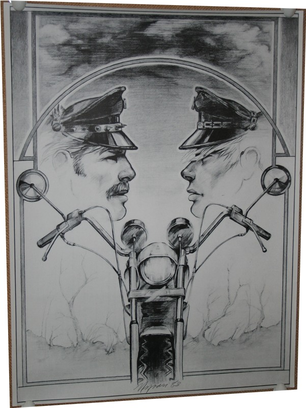 (According to a friend of Uyvari's who sold this poster in 2006, this artwork was produced for a 1970s Milwaukee motorcycle run, and was printed both with and without the run name. Robert signed a number of these posters prior to a show he had in San Francisco in 1983.)