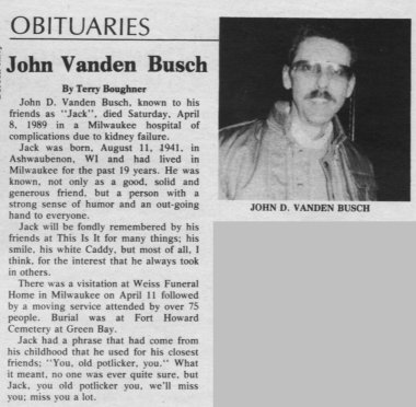 John Vanden Busch, known to his friends as "Jack", was born on August 11, 1941 in Ashwaubenon, Wisconsin, moving to Milwaukee in 1970. He was known not only as a good, solid and generous friend, but as a person with a strong sense of humor and an out-going hand to everyone. Jack was fondly remembered by his friends at the "This Is It" bar for many things; his smile, his white Caddy (Cadillac), but most of all, for the interest that he always took in others. Jack had a phrase that had come from his childhood that he ujsed for his closest friends: "You old potlicker, you." What it meant no one was ever quite sure...