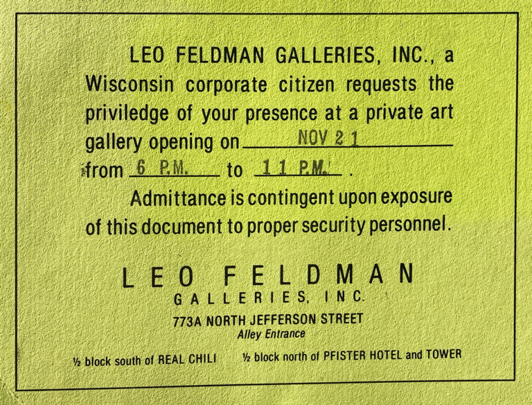 The Leo Feldman Gallery showed artists like 'Pete the Beat' who was both a poet and collagist. Beat would later die from AIDS. Skyberg's curatorial talent roster included his best friend Moe Meyer, who was the first performance artist at the MAM, and de KRAMO (Daniel Kramoris) the painter. Sister Cashbox, Jerome Voelske, Ringo White, Francis Ford, Sally Kolf, Matthew Wytch and many other Wisconsin artists were also given space to show their work. Even the enigmatic Theatre X did a performance there with Swedish artist Jord Circus for the very first Earth Day Celebration.