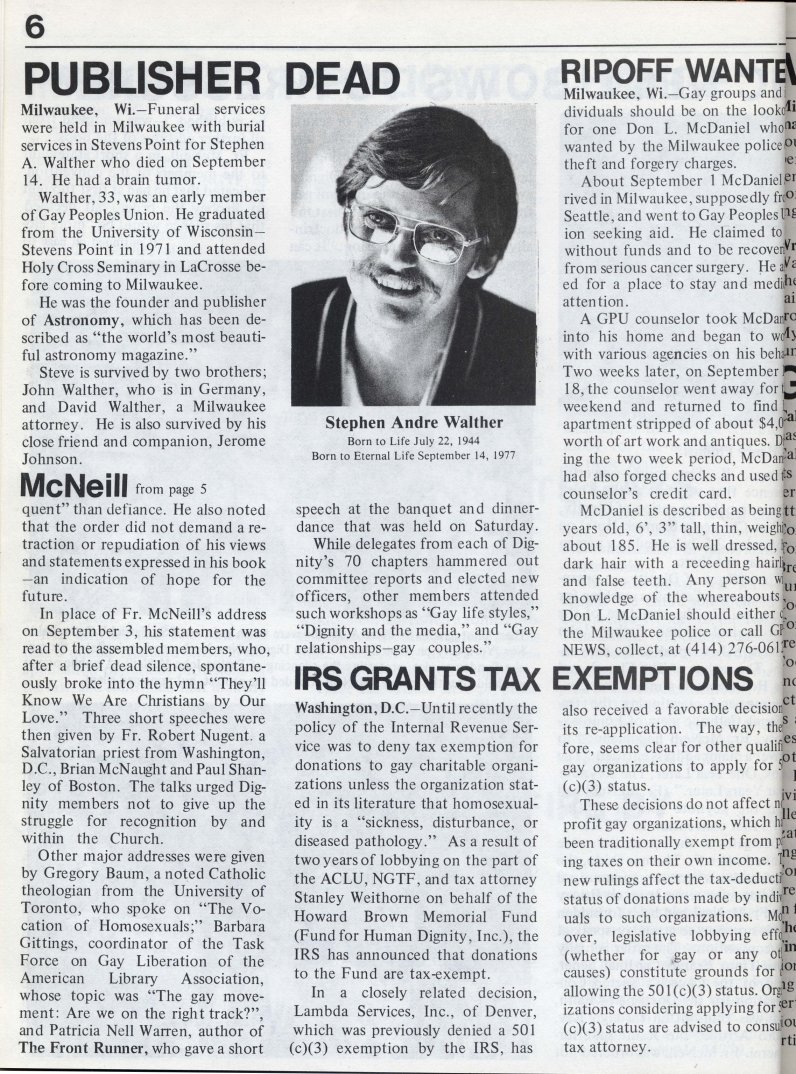 Stephen Andre Walther graduated from the University of Wisconsin- Stevens Point in 1971, and attended Holy Cross Seminary in La Crosse before moving to Milwaukee. Walther became one of the early members of Gay Peoples Union, and was very active in that organization. Walther is best known nationally and internationally as founder and publisher of Astronomy magazine, which even at the time of his death, was described as "the world's most beautiful astronomy magazine". That magazines continues to be the preeminent magazine for fans of astronomy 30 years later. Stephen Walther passed away on September 14, 1977, of a brain tumor. Steve was survived by two brothers: John Walther (who lived in Germany at the time), and David Walther (a Milwaukee attorney). He was also survived by his close friend and companion, Jerome Johnson. After funeral services in Milwaukee, Steve was buried in Stevens Point. The following is an excerpt from an article about the early history of Astronomy magazine on the Astronomy.com website, written by Dave Eicher, editor of Astronomy Magazine early in the 21st century:"Little did Steve Walther know that his brainchild would turn into the greatest magazine about astronomy in the world. At 29, the ambitious graduate of the University of Wisconsin-Stevens Point launched a periodical about his first love, the stars. The first issue, August 1973, held 48 pages and five feature articles, plus information about what to see in the night sky that month. Walther had grown up in the Milwaukee area and taken jobs in public relations after college, always at least dabbling in his beloved pursuit of astronomy. He worked part time as a planetarium lecturer at the University of Wisconsin-Milwaukee and developed a keen interest in photographing constellations. His gift to the world would live on, but, sadly, he would not. With the magazine catching on rapidly, Walther threw a party for contributing authors, photographers, and sponsors in the summer of 1976. Beside a pool, surrounded by drinks and hors d'oeuvres, talking his best game with his closest friends, Steve Walther collapsed, insensible. He died the following year, the victim of a brain tumor." |