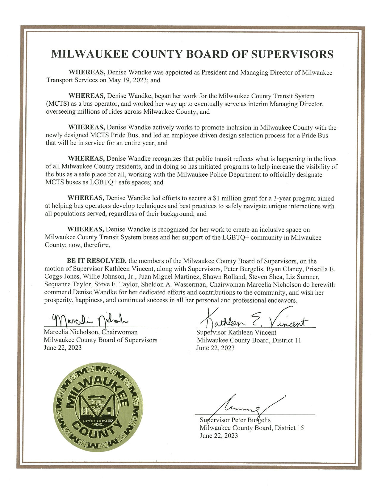 - WHEREAS, Denise Wandke is recognized for her work to create an inclusive space on Milwaukee County Transit System buses and her support of the LGBTQ+ community in Milwaukee County; now, therefore,