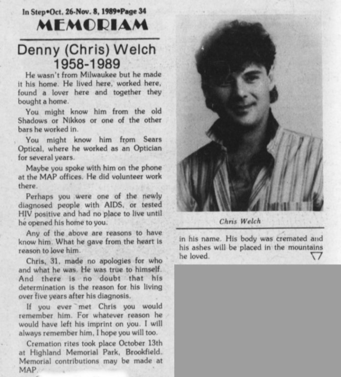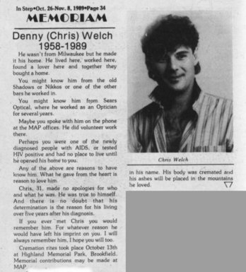 Denny (Chris) Welch wasn't born in Milwaukee, but he made it his home. He lived here, worked here, found a lover here and together they bought a home. Chris worked at several bars in the 1980's, including the old Shadows and Nikos. He also was an optician for Sears Optical for several years. Chris was also active in AIDS causes. He was a volunteer, doing phone work out of the MAP (Milwaukee AIDS Project) offices, and opened his home to several people with AIDS who needed a place to live. |