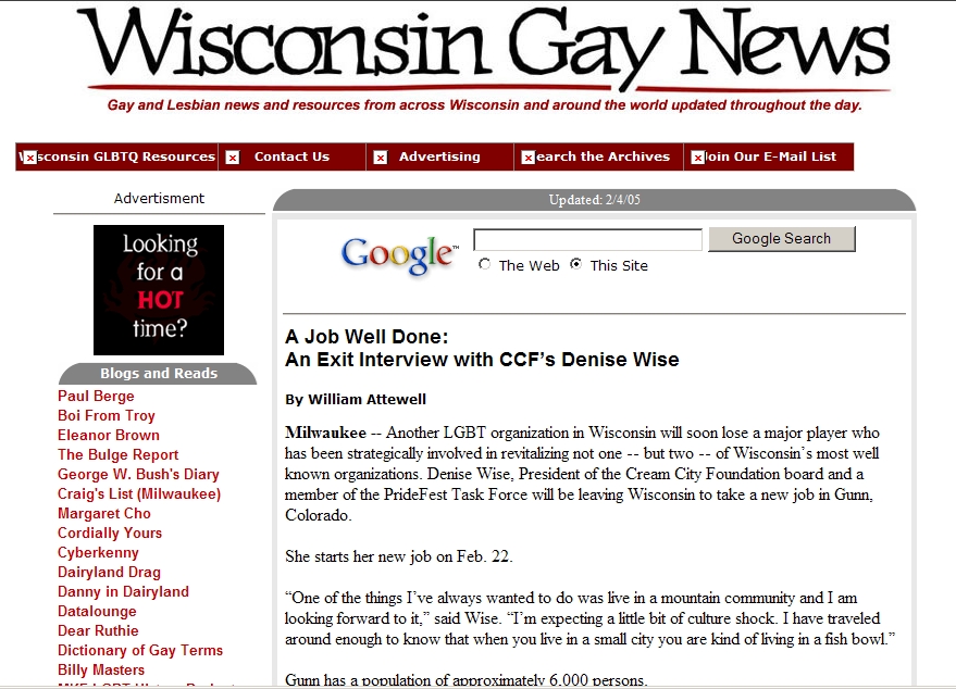 ![]() Exit Interview from WisconsinGayNews, Feb. 2005 |