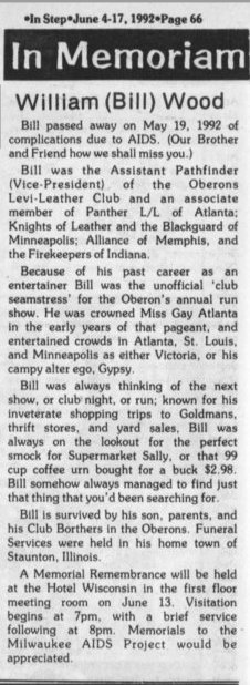 Bill was the Assistant Pathfinder (Vice President) of the Oberons Levi-Leather Club, and an associate member of Panther L/L of Atlanta; Knights of Leather and the Blackguard of Minneapolis; Alliance of Memphis; and the Firekeepers of Indiana.