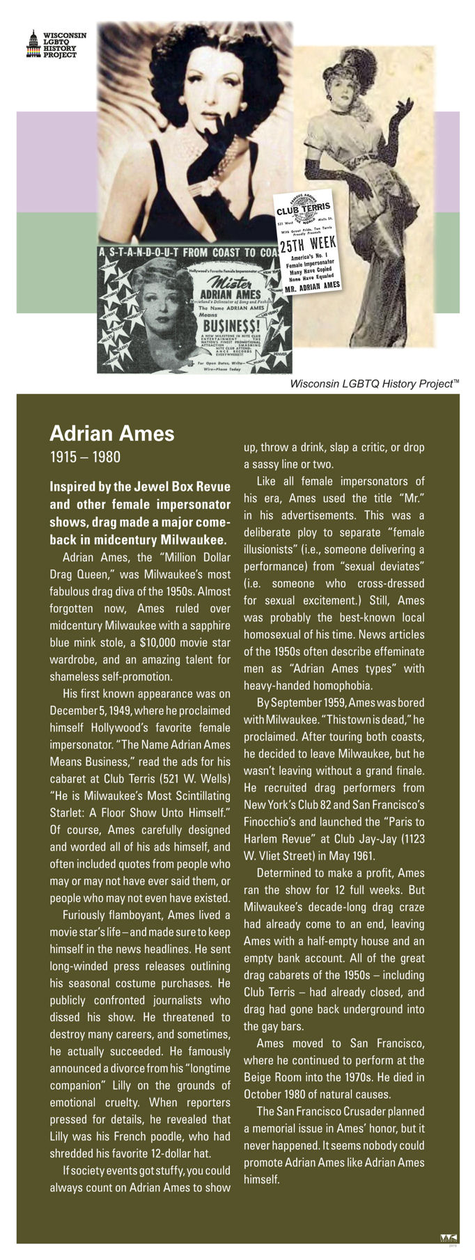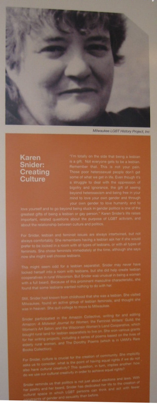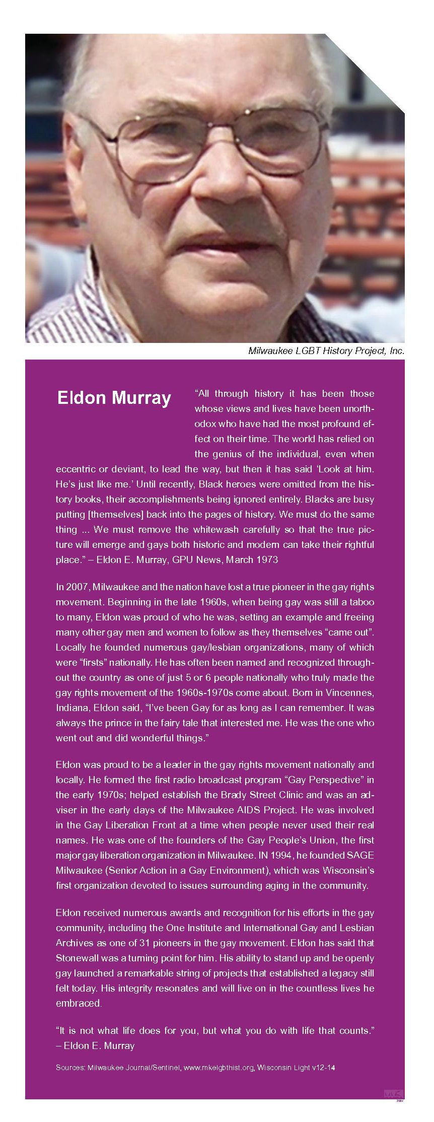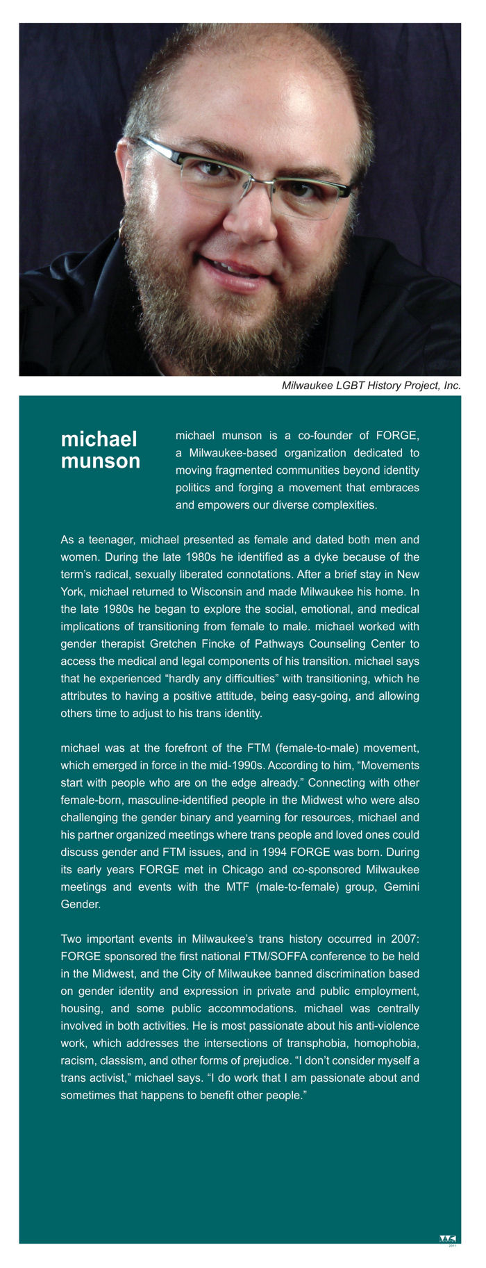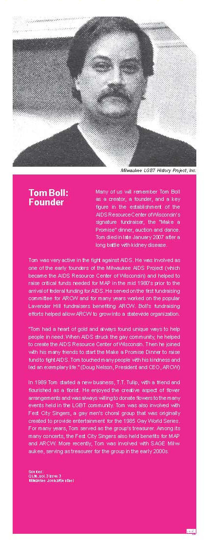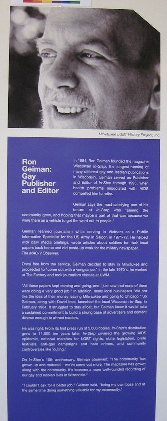 The following images indicate the historical panels developed either by the Wisconsin LGBTQ History Project, or by its predecessor, the Milwaukee LGBT History Project. A few of these panels may be 'in stock' but most would need to be printed should they be needed for a display.