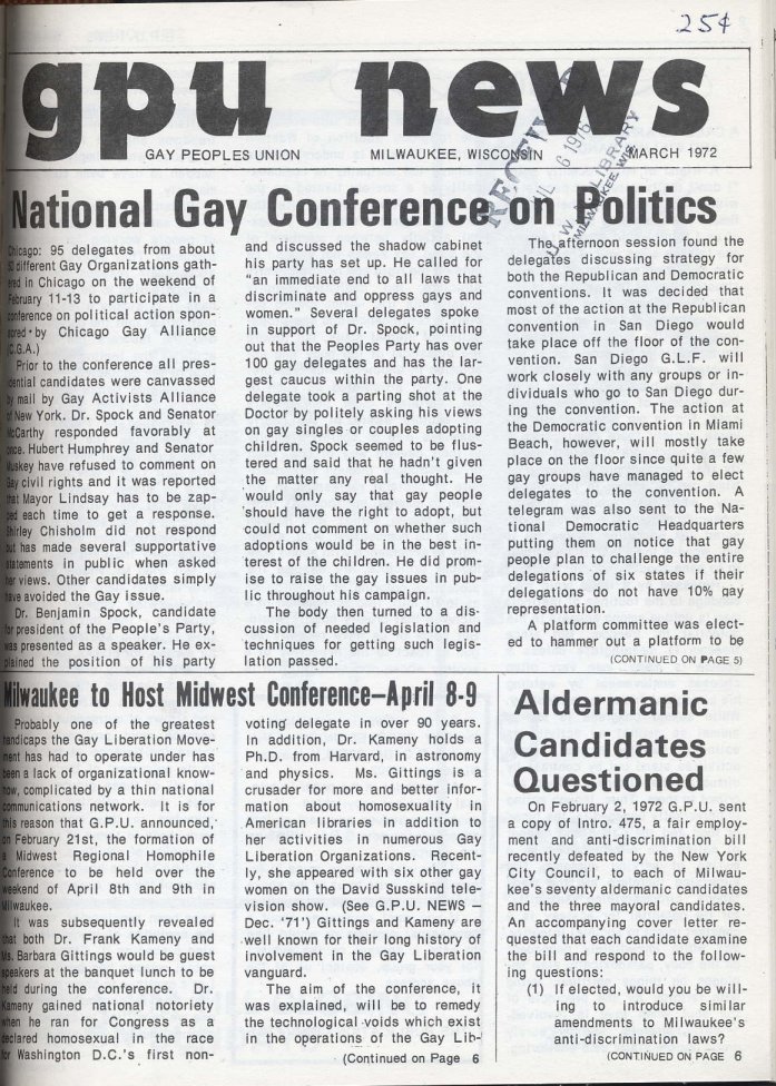 35 years ago-- 1972-- The March 1972 issue of the GPU News (Gay Peoples Union) newsletter was distributed to all members of the state Assembly and Senate, in the name of gay liberation and rights. Meanwhile, members of motorcycle-leather groups around the Midwest met at the Stud Bar in the Royal Hotel in Milwaukee to help the Lake Riders Motorcycle Club celebrate its anniversary.