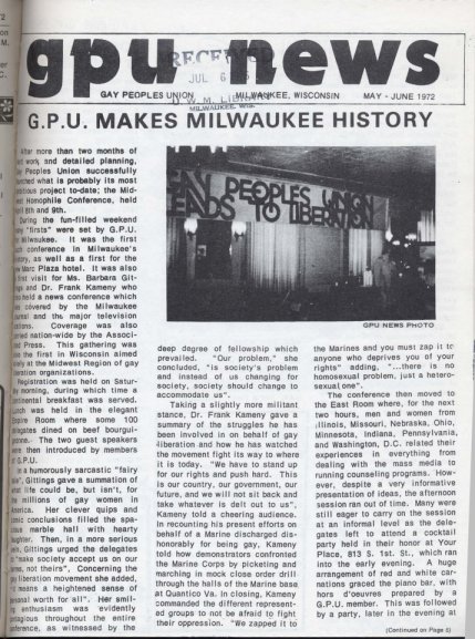 35 years ago-- 1972-- 30 people meet in Church For All People to plan a Gay Pride week for Milwaukee. Madison Gay Liberation Front files brief in defense of Paul Safransky, the first litigation in the history of Wisoncin raising the question of a homosexual's right to hold public employment. James Rusk and Nick Gagalaino hold a marriage ceremony by a Catholic priest at a private home in Green Bay. Businesses popular at this time: Your Place, Factory, Ten Hundred East bars, Rhubarb Books and Ramie's adult bookstore, all in Milwaukee; and the Back Door in Madison.