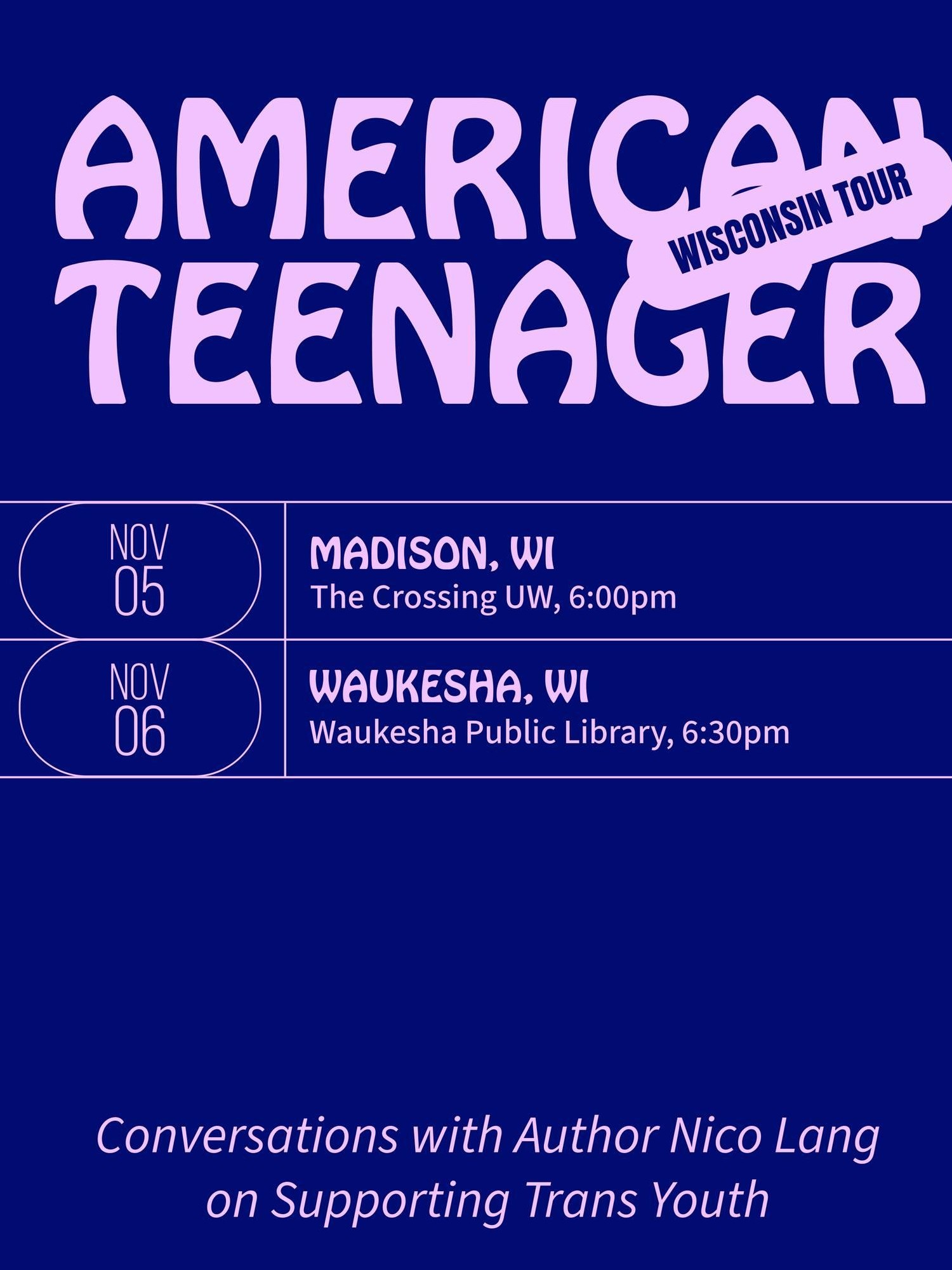 From November 1 to November 6, Nico will make six stops in Wisconsin cities, celebrating the strength and resilience of genderfluid, transgender, and non-binary youth across America, as chronicled in the new book, American Teenager.