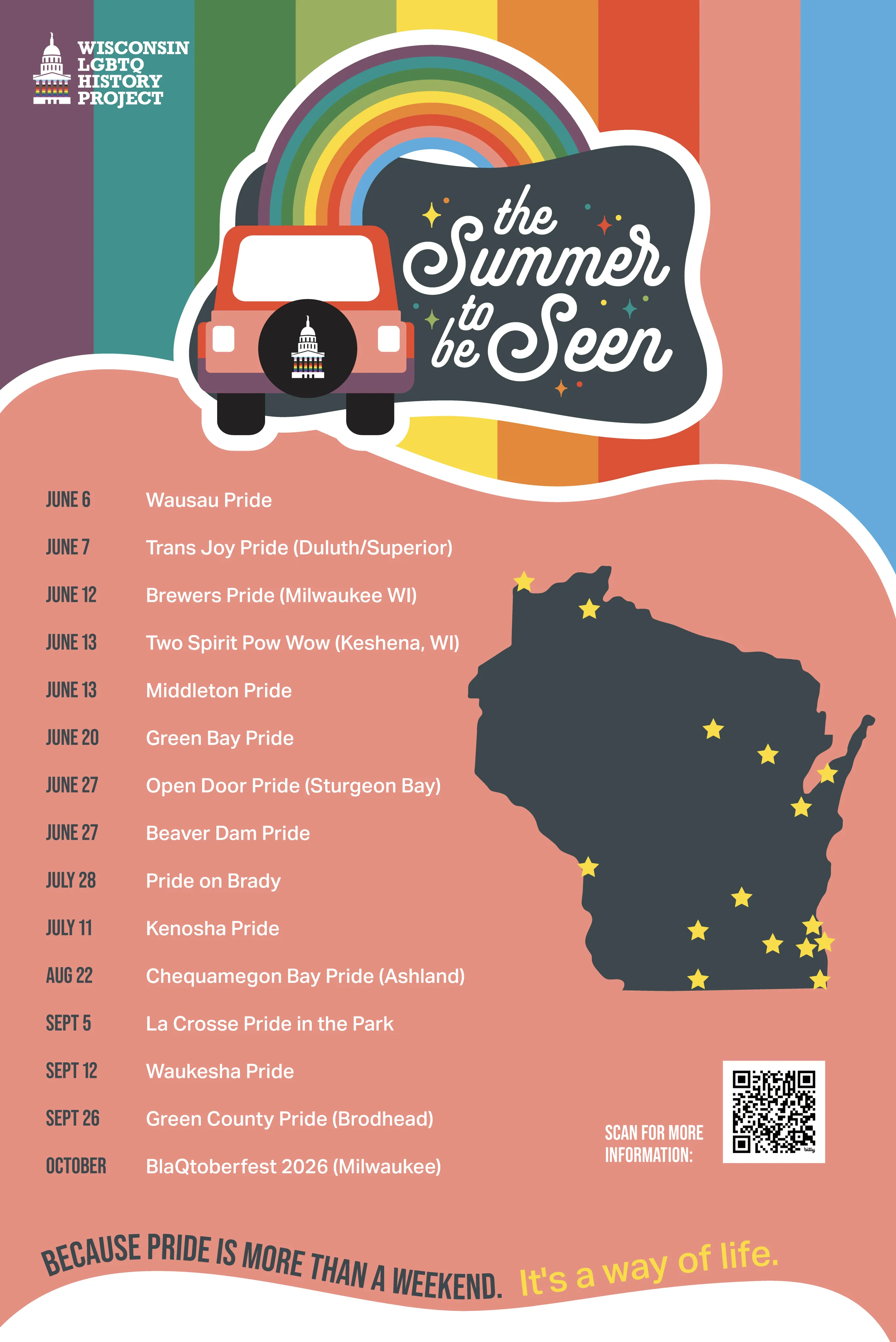 Our 3rd Annual Summer to be Seen tour kicks off Saturday, June 6, at Wausau Pride and continues across five months, 13 diverse communities, and 15 events before concluding in October at BlaQtoberfest in Milwaukee. Watch for an entirely NEW exhibit, featuring the stories of people, places, events, and organizations that made Wisconsin LGBTQ history happen.