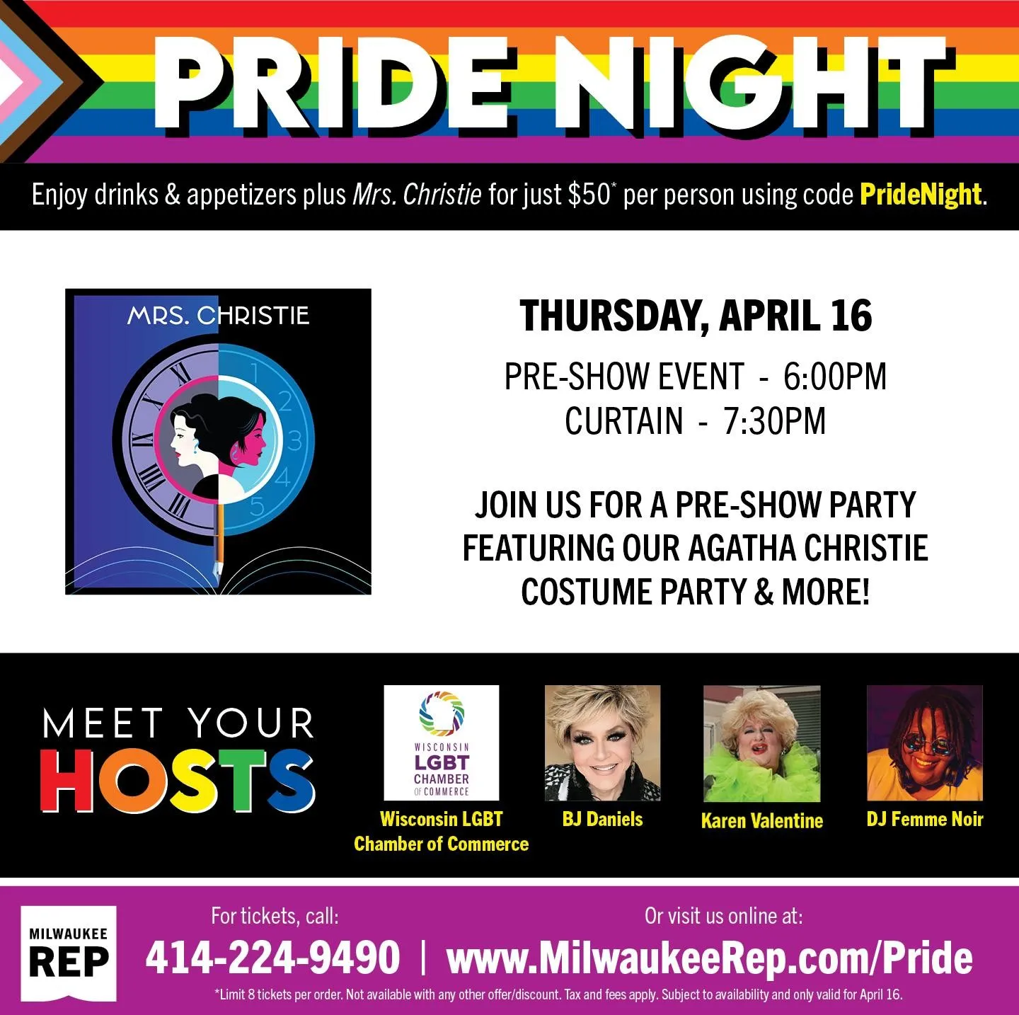 On Thursday, April 16, join our hosts BJ Daniels, Karen Valentine, DJ Femme Noir and members of the Wisconsin LGBT Chamber of Commerce at the Checota Powerhouse Theater for a legendary Pride Night celebration at "Mrs. Christie." Explore over 100 years of local LGBTQ history via a special pop-up exhibit celebrating the performing arts, courtesy of Wisconsin LGBTQ History Project.