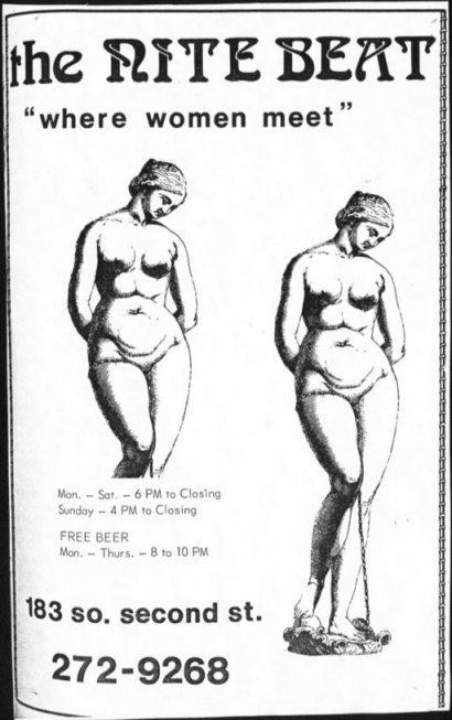 For reasons unknown, the Nite Beat moved to 183 S. 2nd St. in 1969. Most women remember this location best -- as a dark, cavernous, and heavily smoky space with limited decor and even less ambience. This is also the only Nite Beat location that allowed women of color. After Stonewall, "butch vs. femme" was starting to fade away, and the next generation sought a less rigorous social space. In 1971, Nite Beat was one of the early advertisers in the GPU News, openly promoting a "Girl Bar""Where Women Meet." Although still married, Stan and Carrie's 13-year partnership ended in 1972, and Nite Beat briefly became "Carrie's" before closing forever.