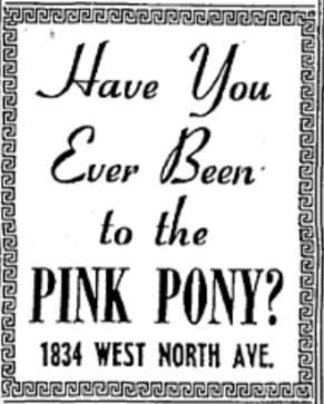 The Pink Pony, a North Avenue gay bar, was known for its seductive atmosphere, fancy decor, and specialized ice cream drinks. When Albert Tusa's Tic Toc Club collapsed in 1955, he took over the Pink Pony and made it a high-end cocktail lounge. The bar was described with subtle "wink-wink" gay references in nightlife articles. It was a favorite stop for lesbians before and after dancing at the nearby Big T. Despite deep neighborhood decline after 1967, including civil unrest, Park West Freeway clearance, and urban renewal, the Pink Pony survived until it was destroyed by arson in 1976.