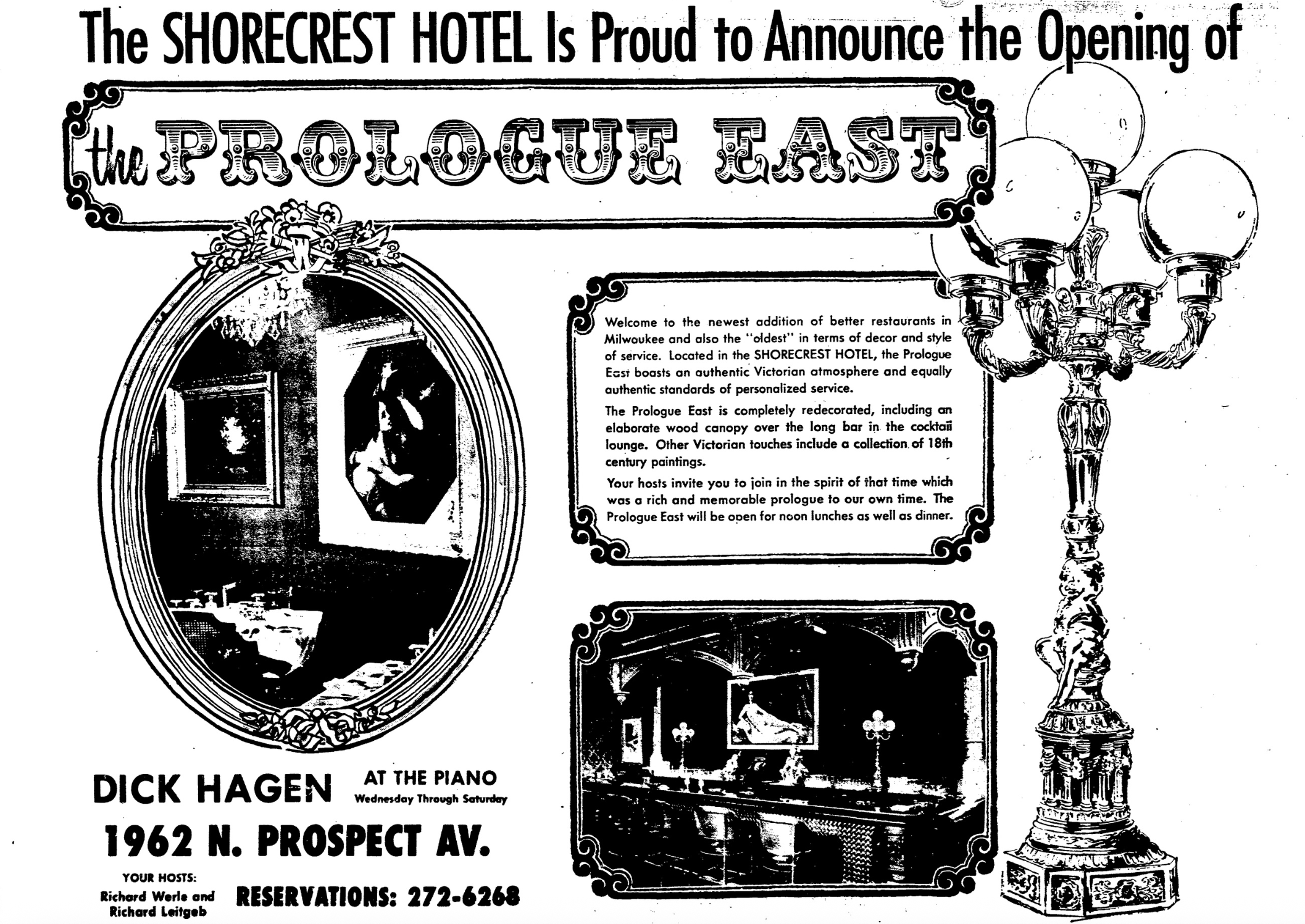 Prologue East opened in August 1968 at the Shorecrest Hotel, launched by Richard Werle and Richard Leitgeb. Although obviously connected to the Prologue "South," it's unclear why a second location opened. Known for authentic Victorian ambiance, Prologue East featured 18th-century paintings, an elaborate wooden canopied cocktail bar, and a focus on personalized service. The high-end menu included Chateaubriand, Oysters Rockefeller, and Harriet King on piano. In early 1971, the IRS filed a tax lien, and the owners chose not to renew their lease. They held a final "Epilogue" party on February 26, 1971 before selling their assets at auction.