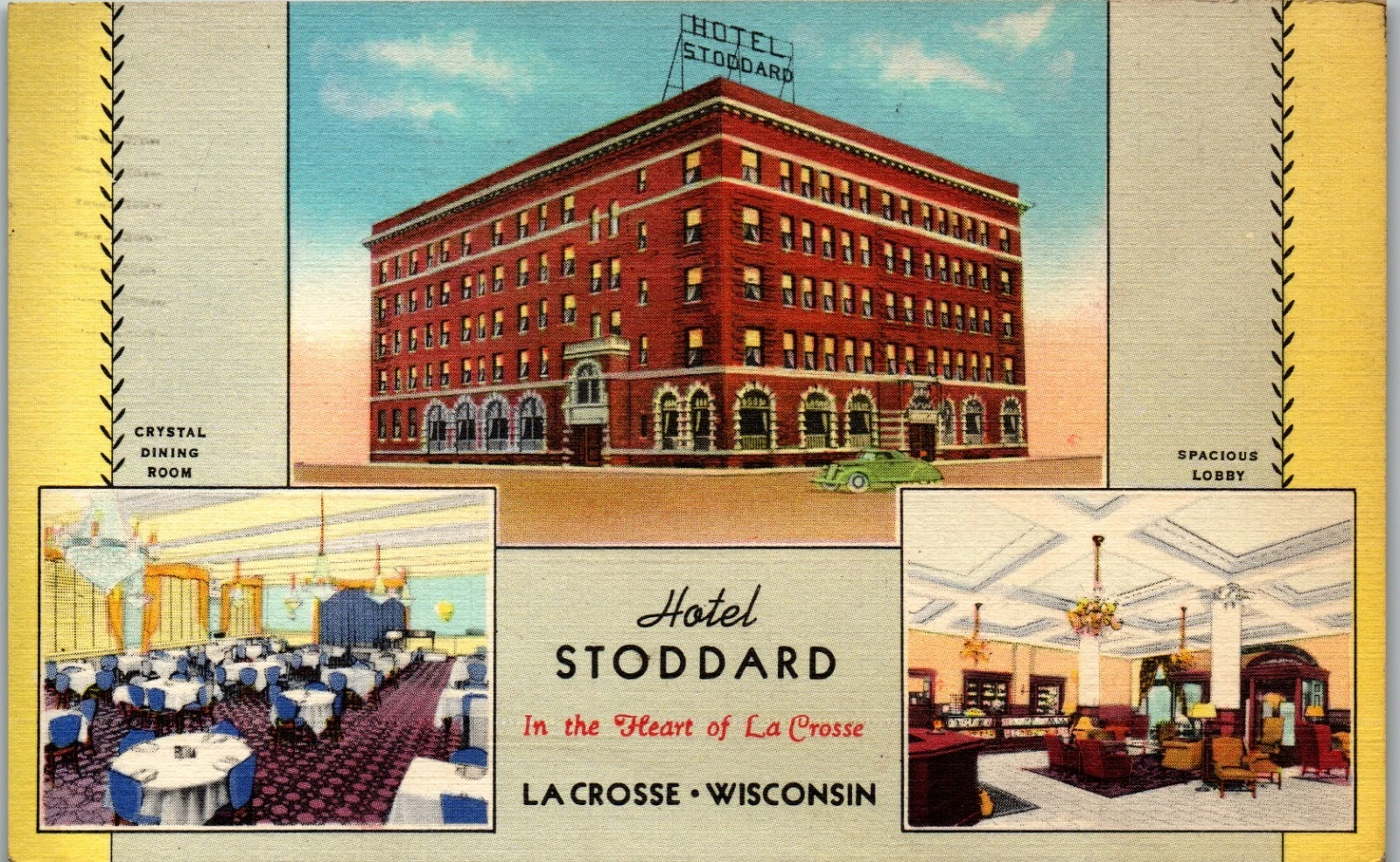 The Stoddard Hotel Bar in La Crosse was a queer space as early as the 1940s. Named after the city's first mayor, The Stoddard was built in 1905 as the city's only fireproof hotel. The historic landmark hosted presidents, celebrities, conventions, and events for decades. The bar was featured in national gay guides in 1976 and 1977, noted for "cruisy" lobby and tearoom action. In later years, the Stoddard became a SRO hotel that residents remember as a "flop house." Demolished in February 1982, the property has been a parking lot ever since.