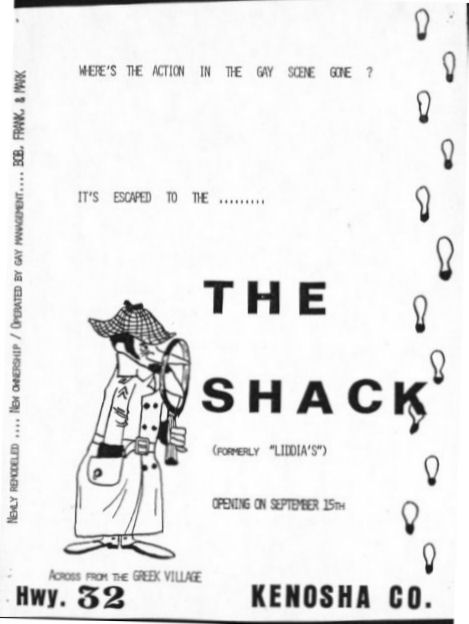 The Shack, located south of Kenosha, opened on September 15, 1972, under new gay ownership. The low-profile tavern, formerly Lydia's, was popular among residents of Racine, Kenosha, and northern Illinois due to its discreet, out-of-the-way location. The Shack was very successful, despite its rundown appearance and harassment by gay bashers. In 1985, Lyons closed The Shack to open the more accessible and spacious Club 94.