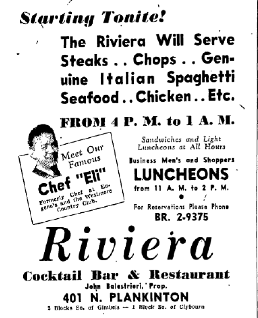 The Riviera, opened November 25, 1949 by John Balestrieri and John Triliegi, was Milwaukee's premier gay bar for 15 years. After World War II, the city's first gayborhood, "The Strip," emerged in the 400 block of N. Plankinton Avenue, replacing historic sailor bars already operating for decades. In 1951, the Machi brothers reopened as Tony’s Riviera. The bar was popular and profitable, drawing ongoing FBI and police attention. On March 15, 1964, a jilted lover ignited a five-alarm fire and destroyed the building. Tony Machi relocated to 952 N. Plankinton Ave. until Pere Marquete Park was developed in 1967.
