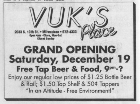 Vuk's Place, a friendly neighborhood bar, opened in December 1992. The bar faced immediate issues, including parking problems, a liquor license dispute, petty crime, a temporary shutdown,and having to rebrand as Vuk's II. Despite dedicated customers, Vuk's could not overcome the challenges of a rapidly changing neighborhood. "Tom," working two full-time jobs, closed the bar in May 1995.
